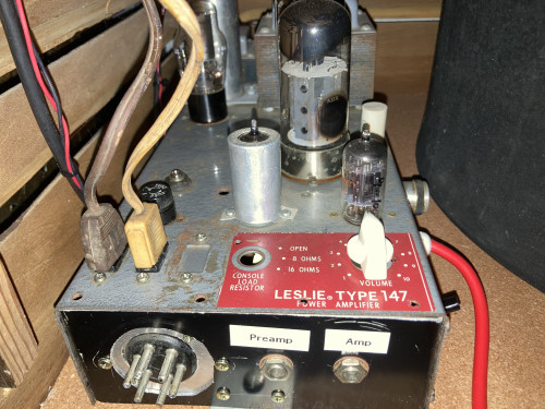 Herunder ses forstærkeren i en Leslie 147, som gennem tiden har været udsat for lidt af hvert. Den er nu restaureret, og der er indbygget en preamp med et ekstra forforstærkerrør, som ses forrest til venstre med hætten på. Der er ligeledes indbygget et lavspændingsrelæ til styring af hastigheden med en footswitch. Det hele er lavet sådan, at tilslutningen med 6-ben stikket stadig fungerer som normalt på en Leslie 147