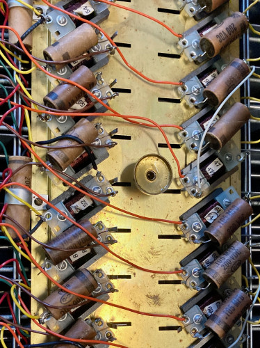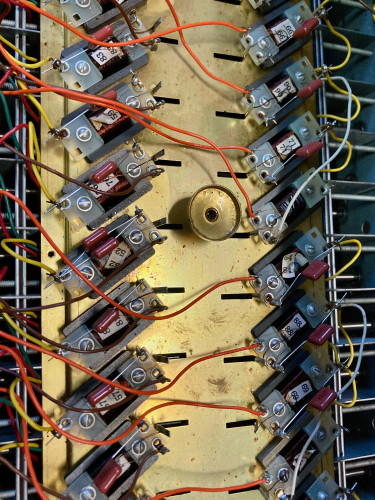 På billedet til venstre ses her et udsnit af tonegeneratoren med de gamle vokskondensatorer.
